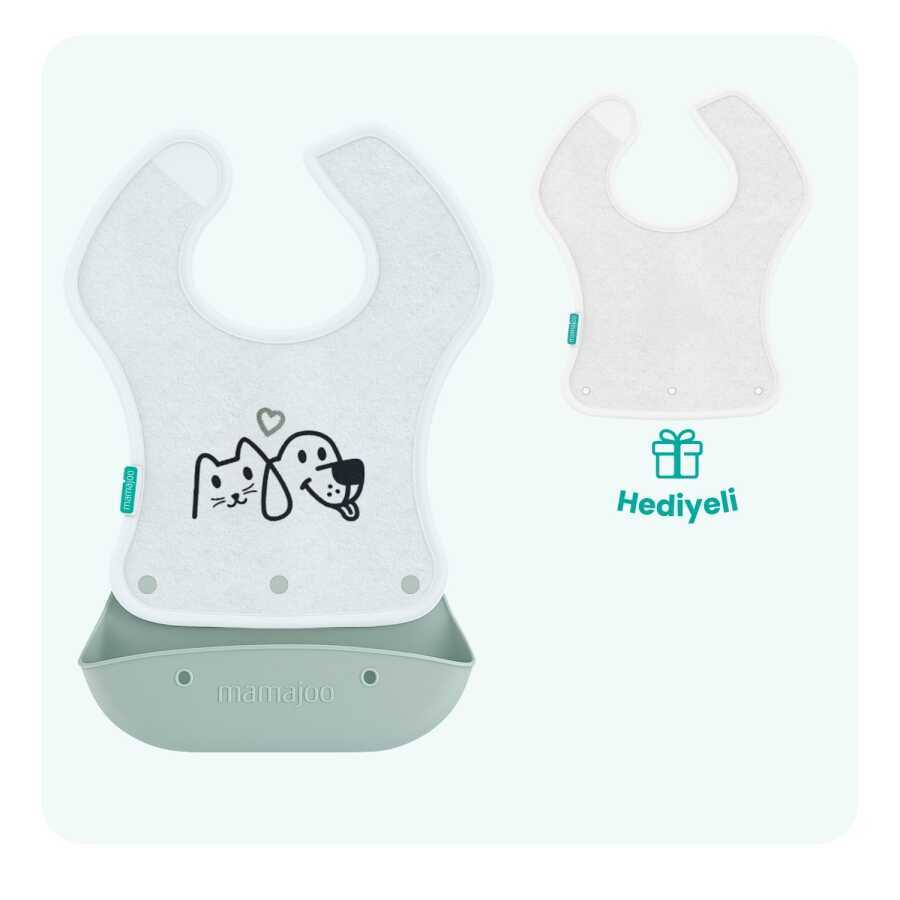 1x Mamajoo Silikon & Kumaş Katlanır Mama Önlüğü | 2-in-1 Powder Green + Kumaş Önlük Hediye