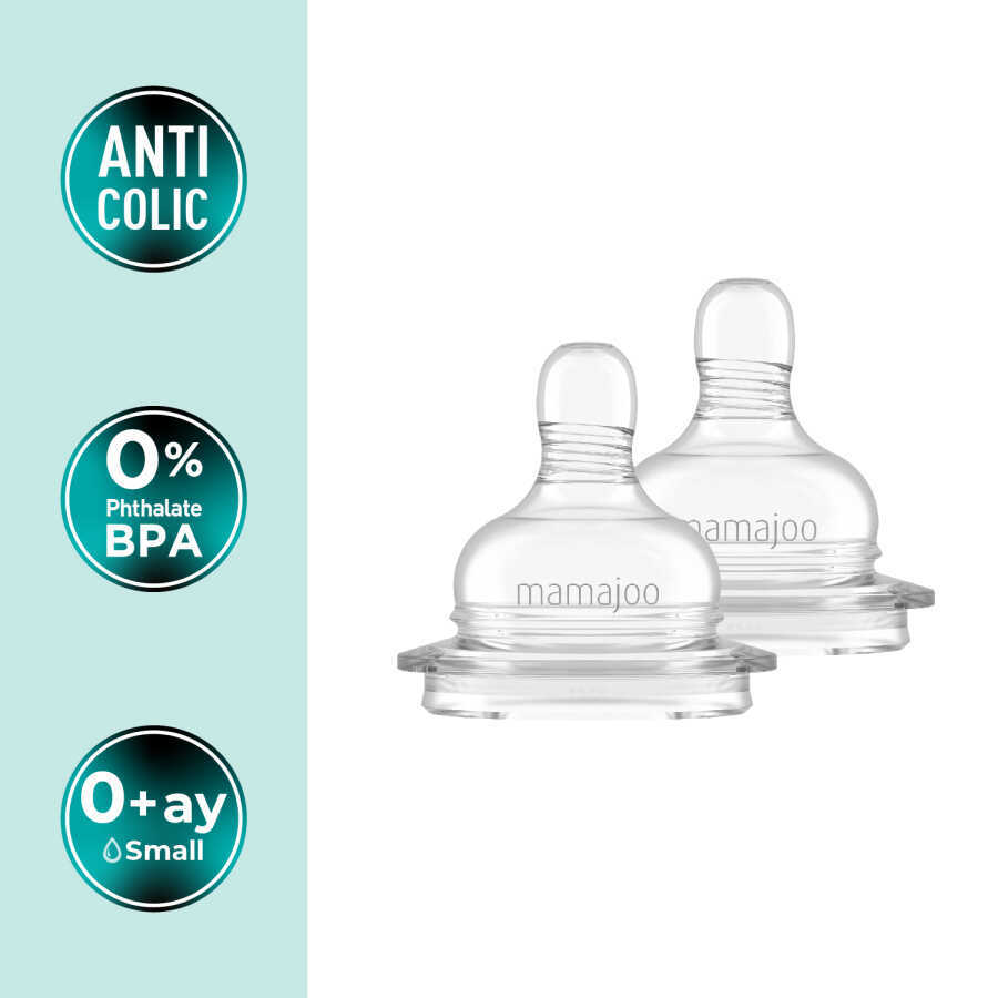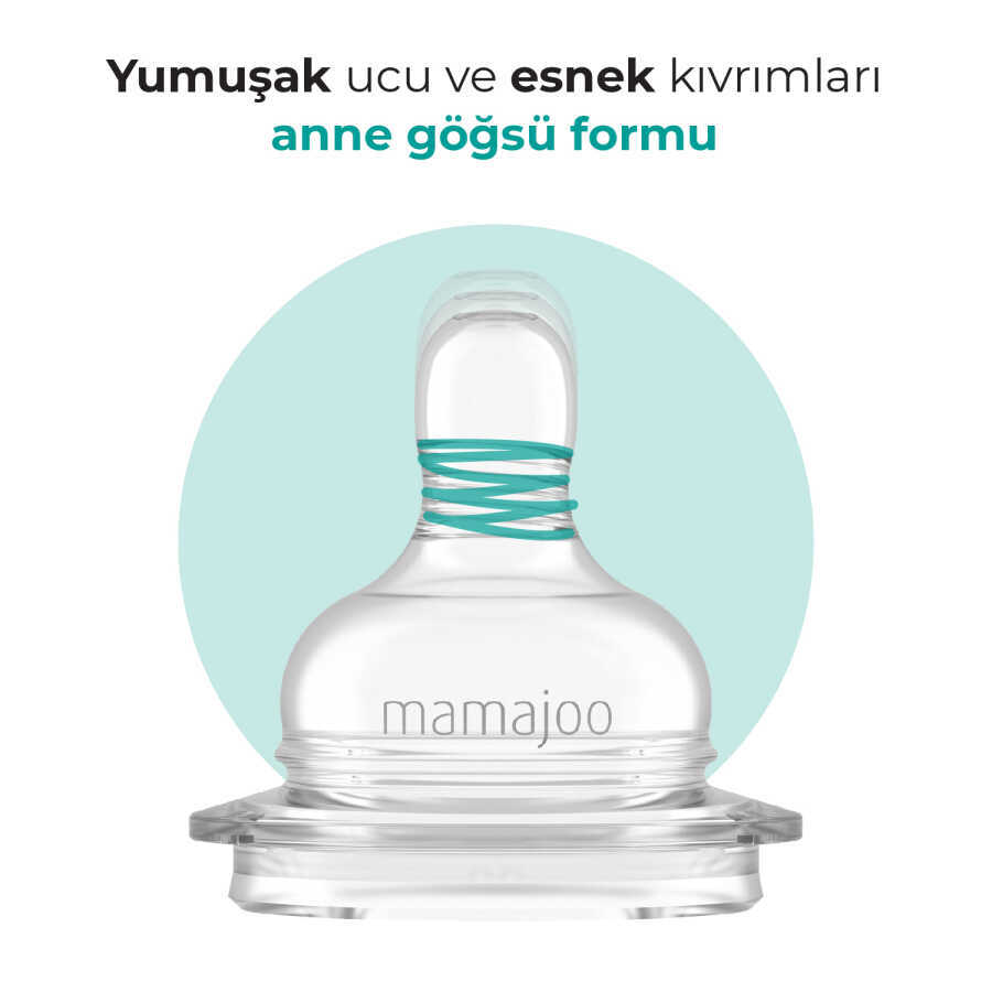 Mamajoo Anti-kolik Biberon Emzikleri, anne göğsünden ilham alınan esnek helezon yapısı ve formuyla doğal emme hissi sunmak üzere tasarlanmıştır ve Mamajoo biberonlar ile kullanılır. Anti-kolik valf sistemi sayesinde bebeğin beslenme sırasında hava yutma riskini azaltmaya yardımcı olur. BPA ve Fitalat içermeyen gıdaya uygun yüksek kaliteli malzemelerden üretilmiştir.