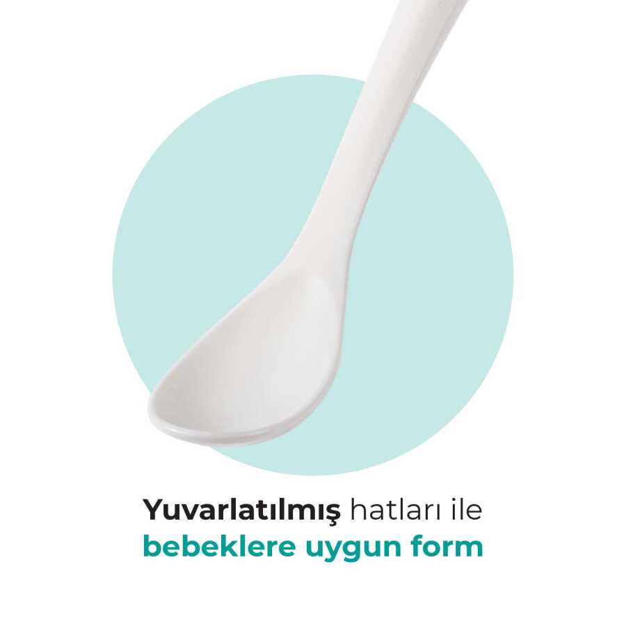 Der ergonomische lange Griff der Mamajoo-Fütterungslöffel ist für eine bequeme Handhabung und Reichweite konzipiert. Die Stütze auf der Rückseite des Löffels ist so konzipiert, dass er nicht in den Teller rutscht.