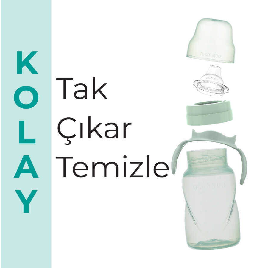 Mamajoo Kulplu Akıtmaz Alıştırma Bardakları, bebeklerin kendi başlarına içmeyi öğrenmelerine destek olmak ve biberondan bardağa geçiş sürecini kolaylaştırmak için yardımcıdır. BPA ve Fitalat içermeyen gıdaya uygun yüksek kaliteli malzemelerden üretilmiştir.