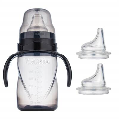Mamajoo Kulplu Akıtmaz Eğitici Bardak Black, bebeklerin biberondan bardağa kolayca geçerek içmeyi öğrenmesine yardımcı olmak için tasarlanmıştır.