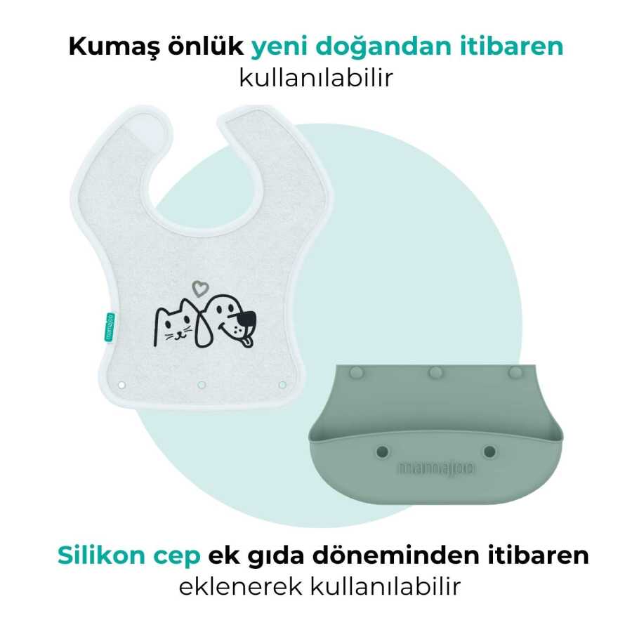 Mamajoo Silikon & Kumaş Katlanır Mama Önlüğü; pamuklu ve su geçirmez kumaş önlük ile silikon cep içeren ayrılabilir 2 parçadan oluşur. Kumaş önlük, bebeğinizin kıyafetlerini ve hassas cildini korurken dışa dönük silikon cep dökülen yiyecekleri toplar. Toplanan yiyecekleri alıp yemeye çalışmak bebeğin ince motor gelişimini destekler. Mamajoo Silikon & Kumaş Katlanır Mama Önlüğü bebekle birlikte büyürken günlük temizliği çok kolay olduğundan son derece pratiktir. Yumuşak bebek önlüğü tasarımı, beslenme sırasında kıyafetlerin kirlenmesini önleyerek hijyenik bir deneyim sağlar.