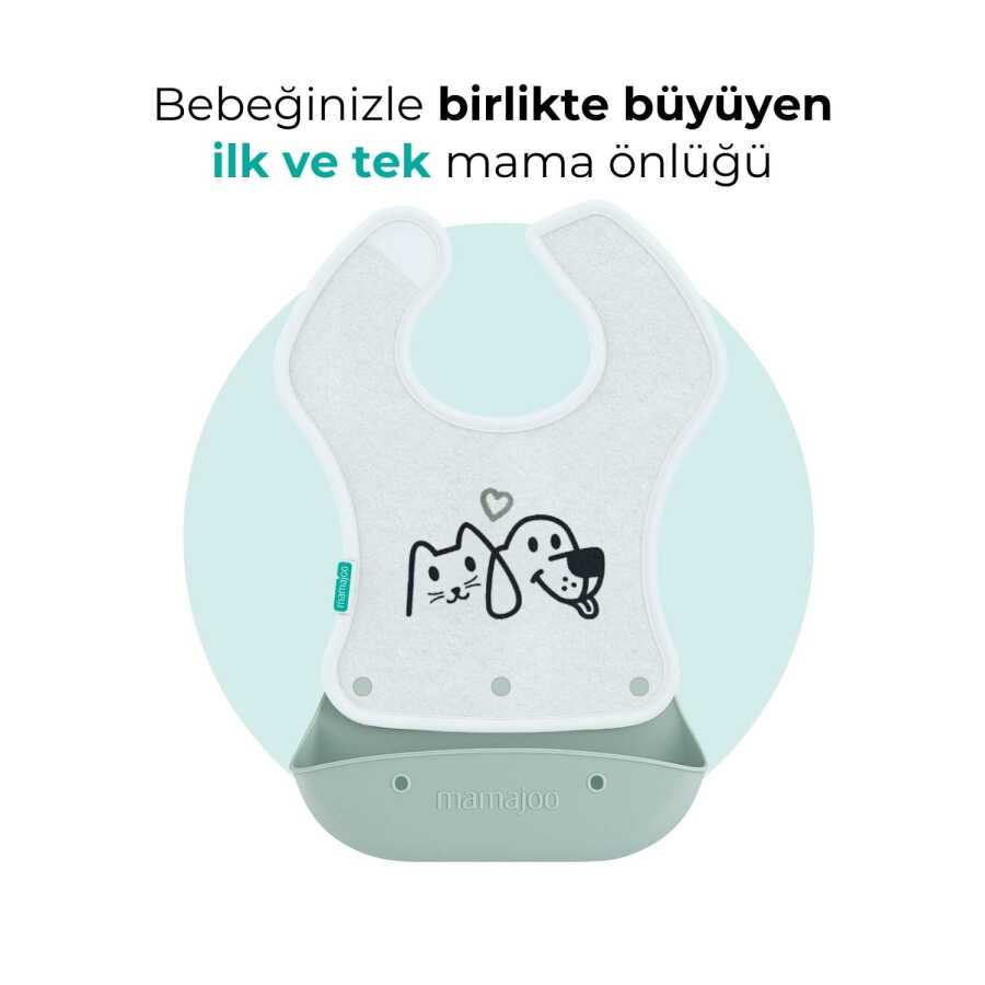 Mamajoo Silikon & Kumaş Katlanır Mama Önlüğü, bebeklerin yenidoğan döneminden itibaren büyüme sürecindeki farklı önlük ihtiyaçlarınızı tek bir ürünle karşılar. BPA ve Fitalat içermeyen gıdaya uygun silikon ve kumaştan üretilmiştir.