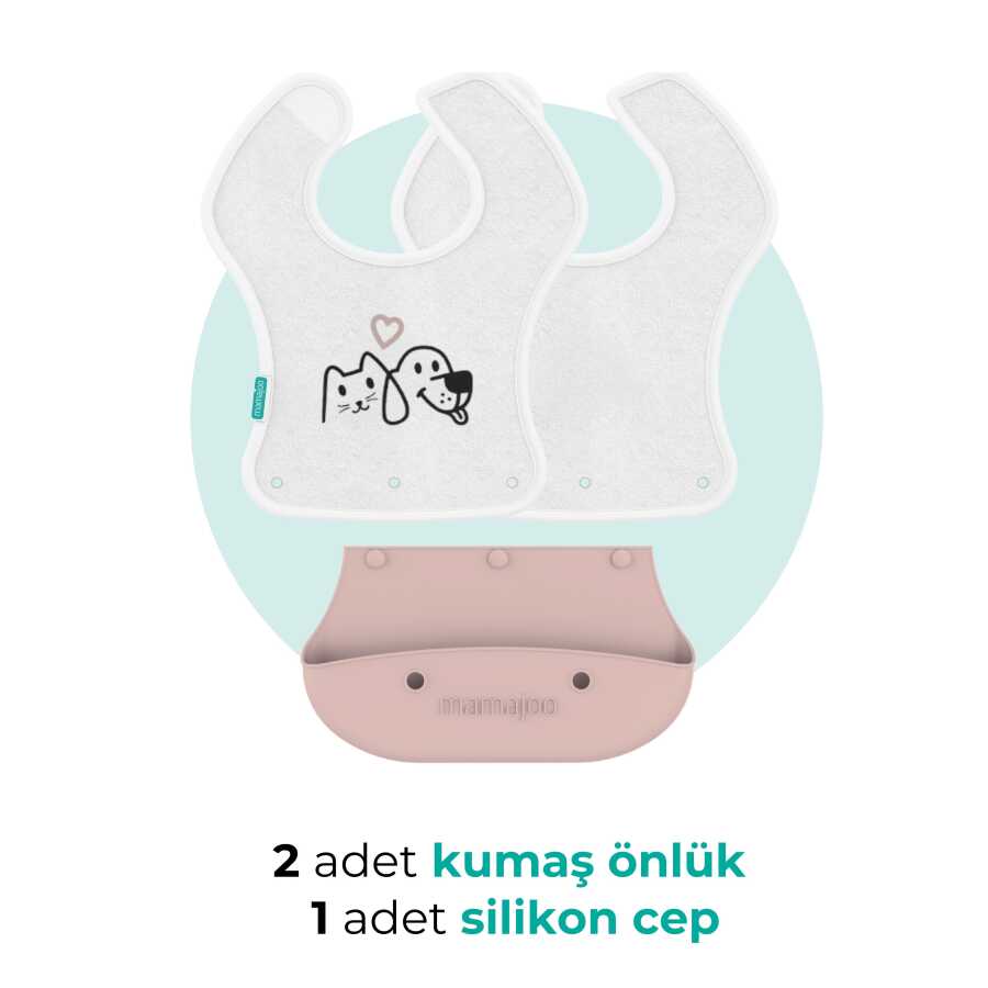 Mamajoo Silikon & Kumaş Katlanır Mama Önlüğü; pamuklu ve su geçirmez kumaş önlük ile silikon cep içeren ayrılabilir 2 parçadan oluşur. Kumaş önlük, bebeğinizin kıyafetlerini ve hassas cildini korurken dışa dönük silikon cep dökülen yiyecekleri toplar. Toplanan yiyecekleri alıp yemeye çalışmak bebeğin ince motor gelişimini destekler. Mamajoo Silikon & Kumaş Katlanır Mama Önlüğü bebekle birlikte büyürken günlük temizliği çok kolay olduğundan son derece pratiktir. Yumuşak bebek önlüğü tasarımı, beslenme sırasında kıyafetlerin kirlenmesini önleyerek hijyenik bir deneyim sağlar.