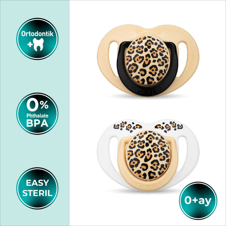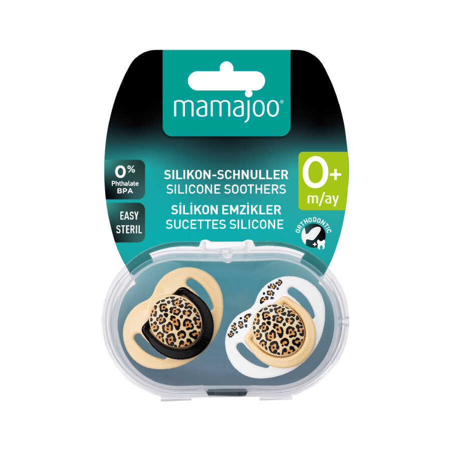 Mamajoo Doppel kieferorthopädische Design Schnuller Beige Leopard mit Sterilisations- und Aufbewahrungsbox / 0+ Monate
