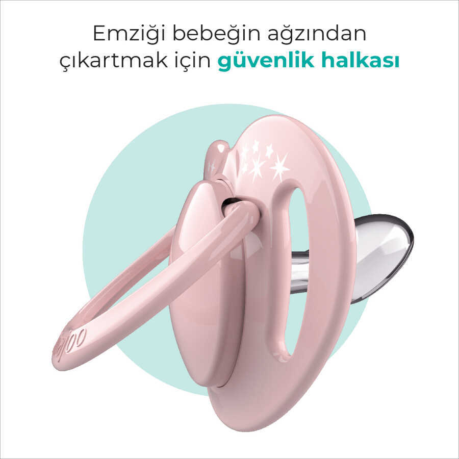 Emziğin silikon ucu bebeklerin diş ve damak gelişimlerine zarar vermemek için damaklı formdadır.